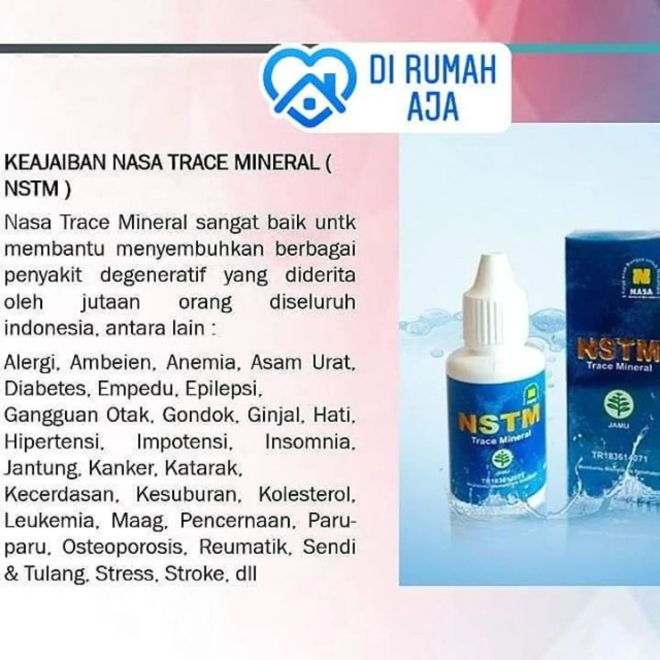 Sebelum kita bahas harga resmi nstm nasa ada baiknya anda membaca informasi di bawah ini dengan harga yang di berikan kami rasa sangat murah sekali jika di banding dengan manfaat yang akan anda dapatkan sNSTM NASA nasa trace mineral adalah obat tetes herbal yang bisa digunakan untuk kesehatan tubuh kitaTrace mineral ini mengandung unsur mineral makro dan. Jual NSTM NASA Untuk Asam Lambung Asli Jember jual nstm nasa untuk diabetes asli jember jual nstm nasa untuk mata asli jemberjual nstm nasa untuk mata min. HERBAL ASAM LAMBUNG.